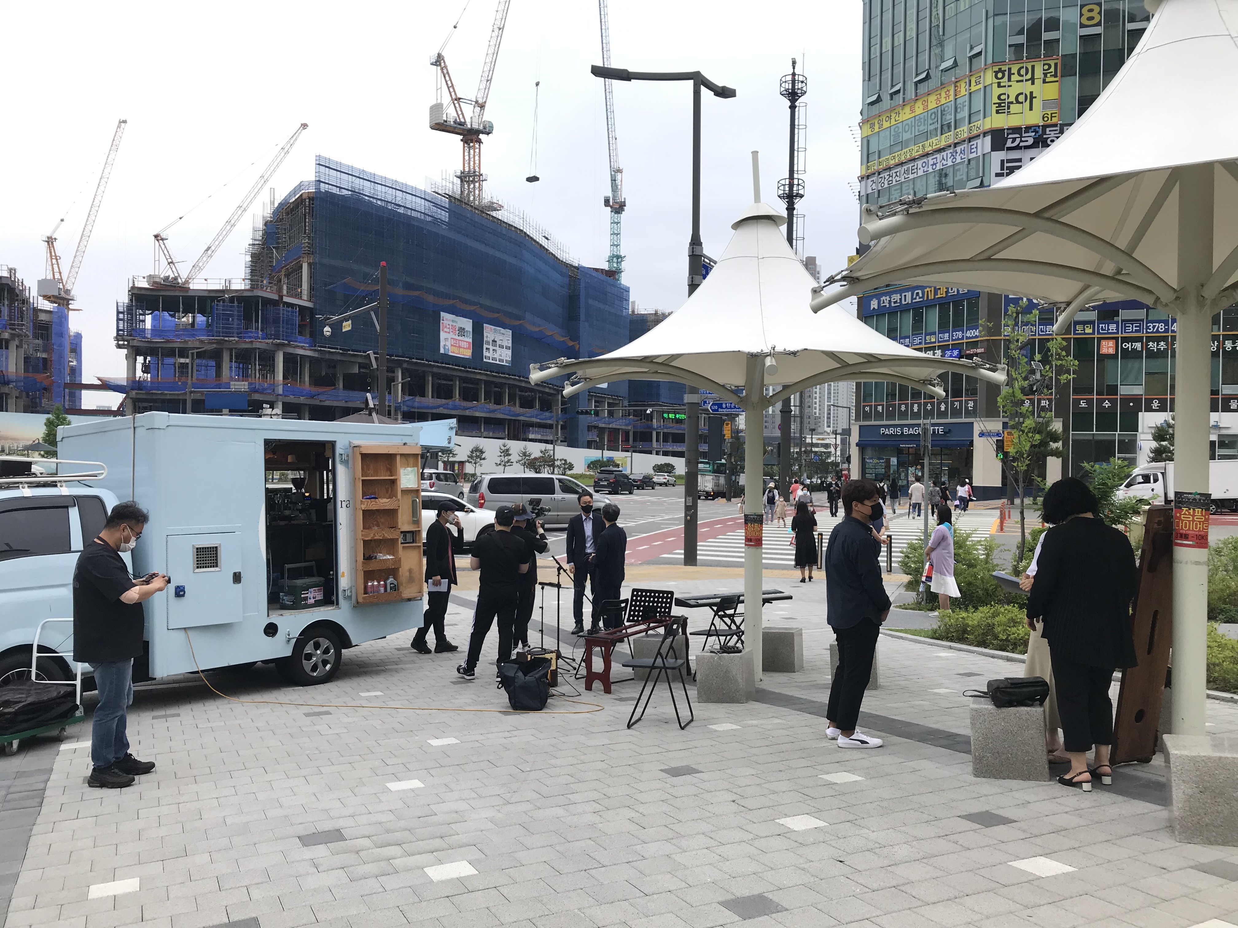 시작하려고 하는데 갑자기 비가 뚝뚝 떨어져 마음이 아팠지만, 왠일인지 장비를 다 차리고 음악을 연주하고 커피를 내리고 시작하니 하늘에서 비가 멈추었습니다. 저희가 행사를 다 마치기까지 비는 오지 않았습니다. 그리고 마치기가 무섭게 비가 내렸습니다. 잠깐의 시간이었지만 성도분들께서 정성스레 준비한 마스크와 달려라커피의 맛있는 고급 커피, 그리고 옆에서 생방으로 펼쳐지는 가야금과 피아노 선율은 너무나 아름답게 울려퍼졌습니다.