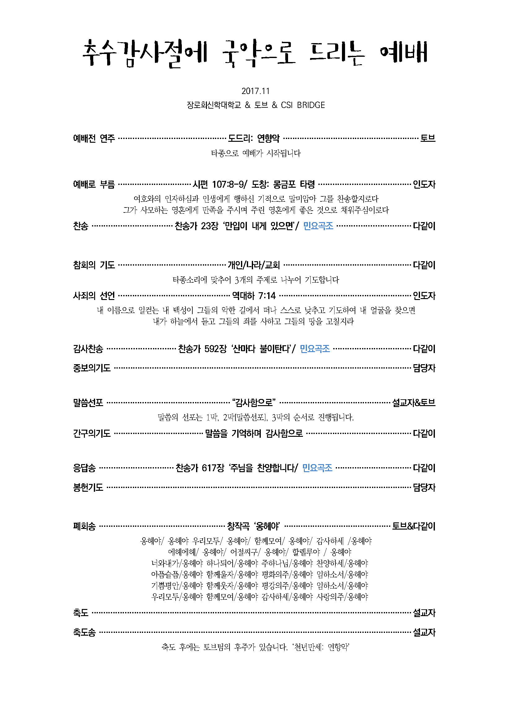 장로회신학대학교와 토브, CSI BRIDGE가 콜라보레이션으로 기획하여 추수감사절 예배로 드리기로 한 기획안입니다. 일정때문에 실제 이 기획안으로 드려지지 못했지만, 이후에 기회가 있을 것으로 생각됩니다.