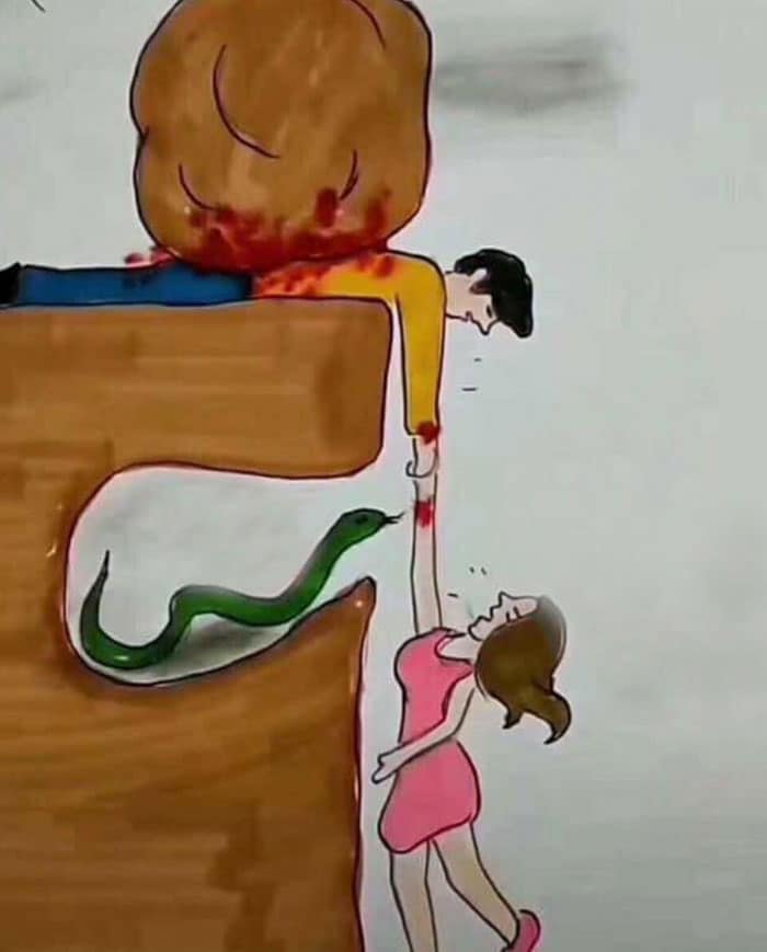 남자는 뱀을 보지 못하고 있고 여자는 남자의 등을 짓누르는 바위를 보지 못합니다.