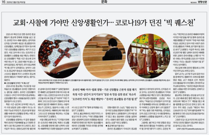 코로나19 확산으로 인한 온라인 종교활동이 종교계 안팎에 파장을 낳고 있다. 온라인 미사·예배·법회는 성직자와 신자들 모두에게 새로운 종교환경이자 신앙생활로, 당혹감을 안기면서 동시에 기존 신앙생활을 성찰하는 계기가 되고 있다. 서로 모여 하나 되는 오프라인 신앙생활의 소중함을 새삼 깨닫는 한편으로 신앙생활이 ‘특정 시간·장소에 모여야만 하는가’ 등 그동안 해본 적 없는 근본적 질문들도 제기된다. 한국 종교계에 ‘빅 퀘스천’이 던져졌다는 분석이 나온다. 또 종교계가 방송과 사회관계망서비스(SNS) 활용에 적극 나서면서 종교계 온라인 활동의 기폭제가 됐다는 평가도 들린다.