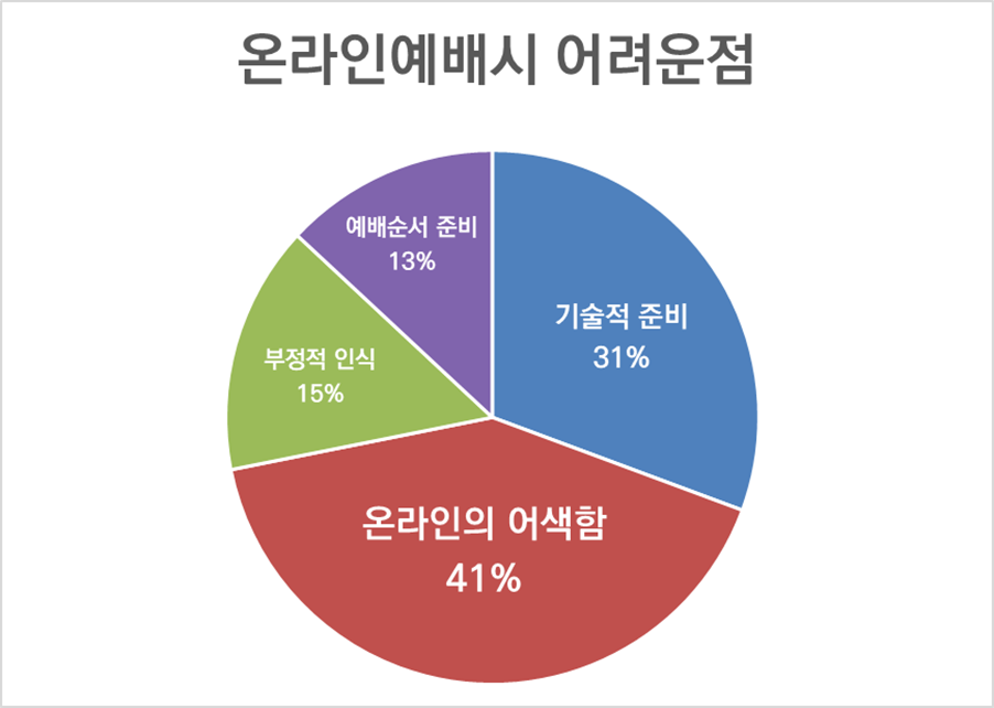 더불어 온라인예배에 대한 성도들의 부정적 인식또한 15%정도나 되는 것으로 보여, 이를 두고 성도들 사이의 혼란과 분열의 모습도 있을 수 있어 연합되는 교회의 노력이 필요해보입니다.