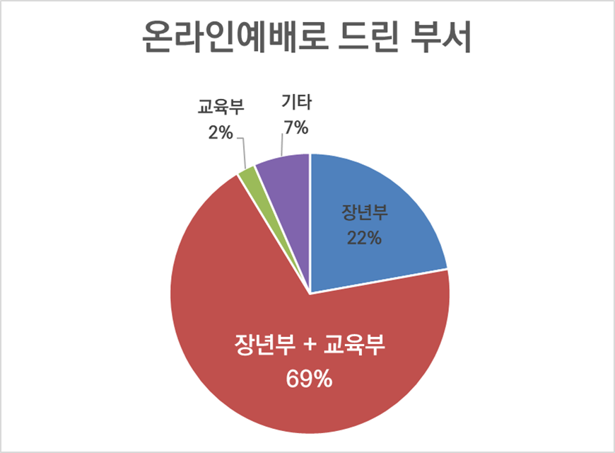 교회 전체가 온라인예배로 드린 교회는 69%, 장년부만 온라인으로 드린 경우는 22%가 되었습니다. 이는 교육부의 특성이 반영된 탓일수도 있고, 온라인예배에 대한 준비가 교육부로 갈수록 어려워서 일 가능성이 있습니다.