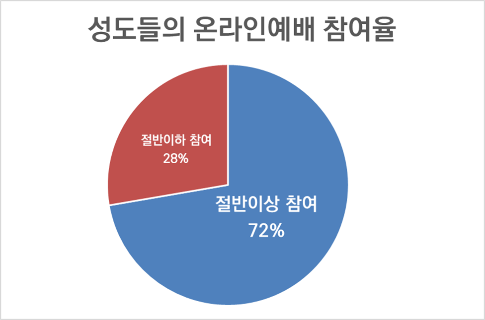온라인예배에 대한 걱정과는 달리, 성도들의 온라인예배의 참여는 교인 절반이상이 참여했다는 답이 72%나 되었습니다.