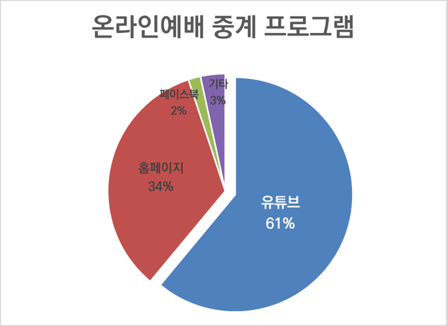 온라인예배 중계시 사용한 프로그램은 대부분 유튜브를 사용한 것으로 파악됩니다. 아무래도 대중적으로 성도들이 익숙하게 아는 것을 통해서 중계한 것으로 보입니다. 홈페이지를 통해서 중계를 한 교회들도 홈페이지와 유튜브에 동시 서비스를 실시했기 때문에 유튜브가 영상중계하는데 가장 많이 사용되었을 것으로 생각됩니다. 페이스북이나 비메오, 인스타그램 등의 서비스를 통해서 중계한 교회들도 있었습니다.