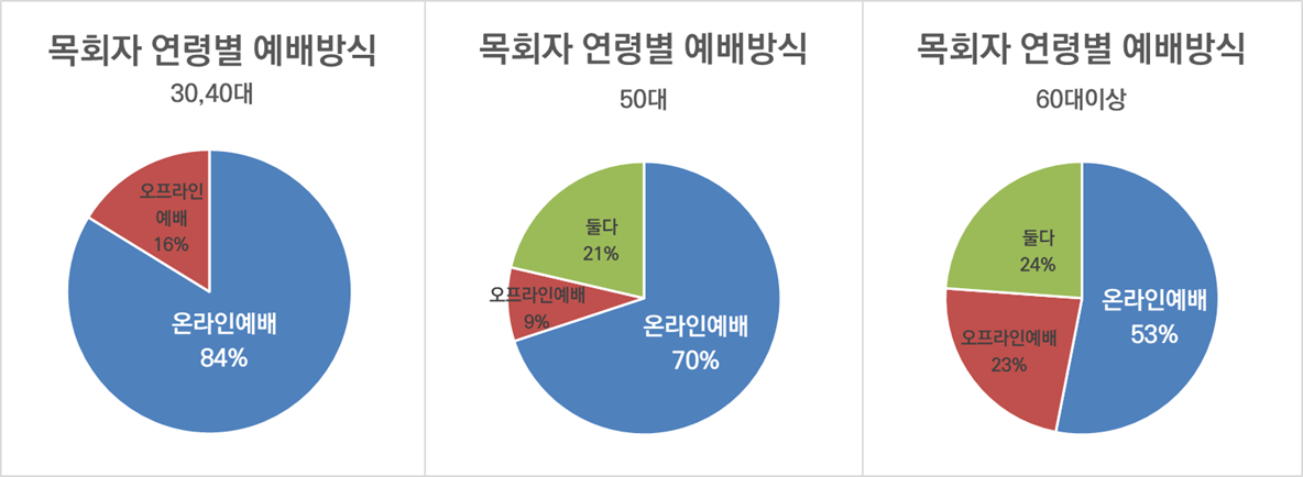 이를 볼 때, 코로나19로 인해 연령대 상관없이 한국교회가 사회적 상황을 인식하고 합리적인 의사 결정과정을 통해 온라인예배를 결정했다고 볼 수 있습니다.