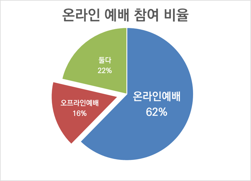 더불어 온라인예배에 대한 성도들의 부정적 인식또한 15%정도나 되는 것으로 보여, 이를 두고 성도들 사이의 혼란과 분열의 모습도 있을 수 있어 연합되는 교회의 노력이 필요해보입니다.